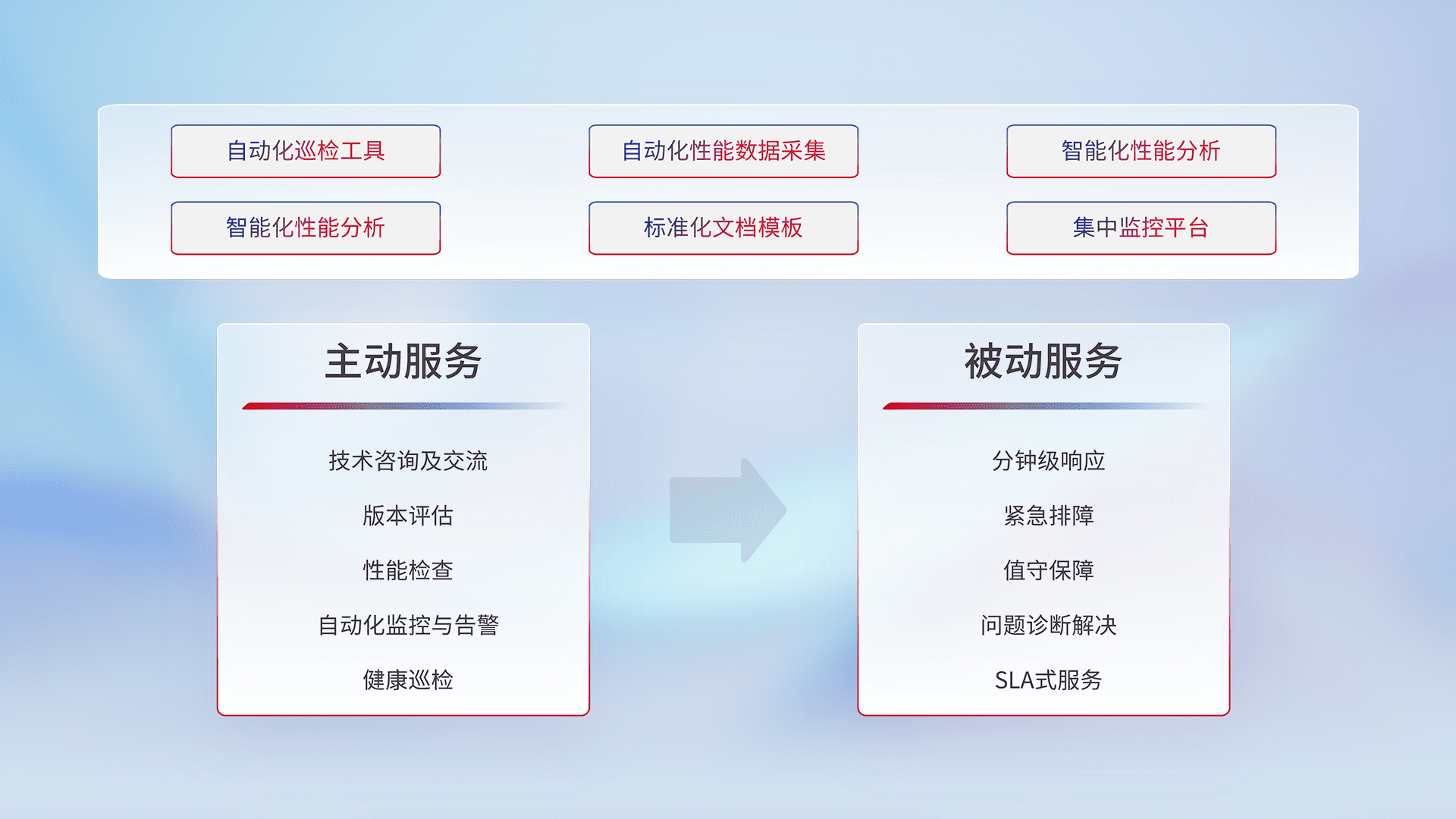 智能化工具和标准化文档,,,保障服务质量,,,提供主动服务(包含技术咨询、、、版本评估、、、、性能检查、、、自动化监控与告警、、、、健康巡检)和被动服务包含(分钟级响应、、、紧急排障、、、值守保障、、问题诊断解决、、、、SLA服务)。。。
