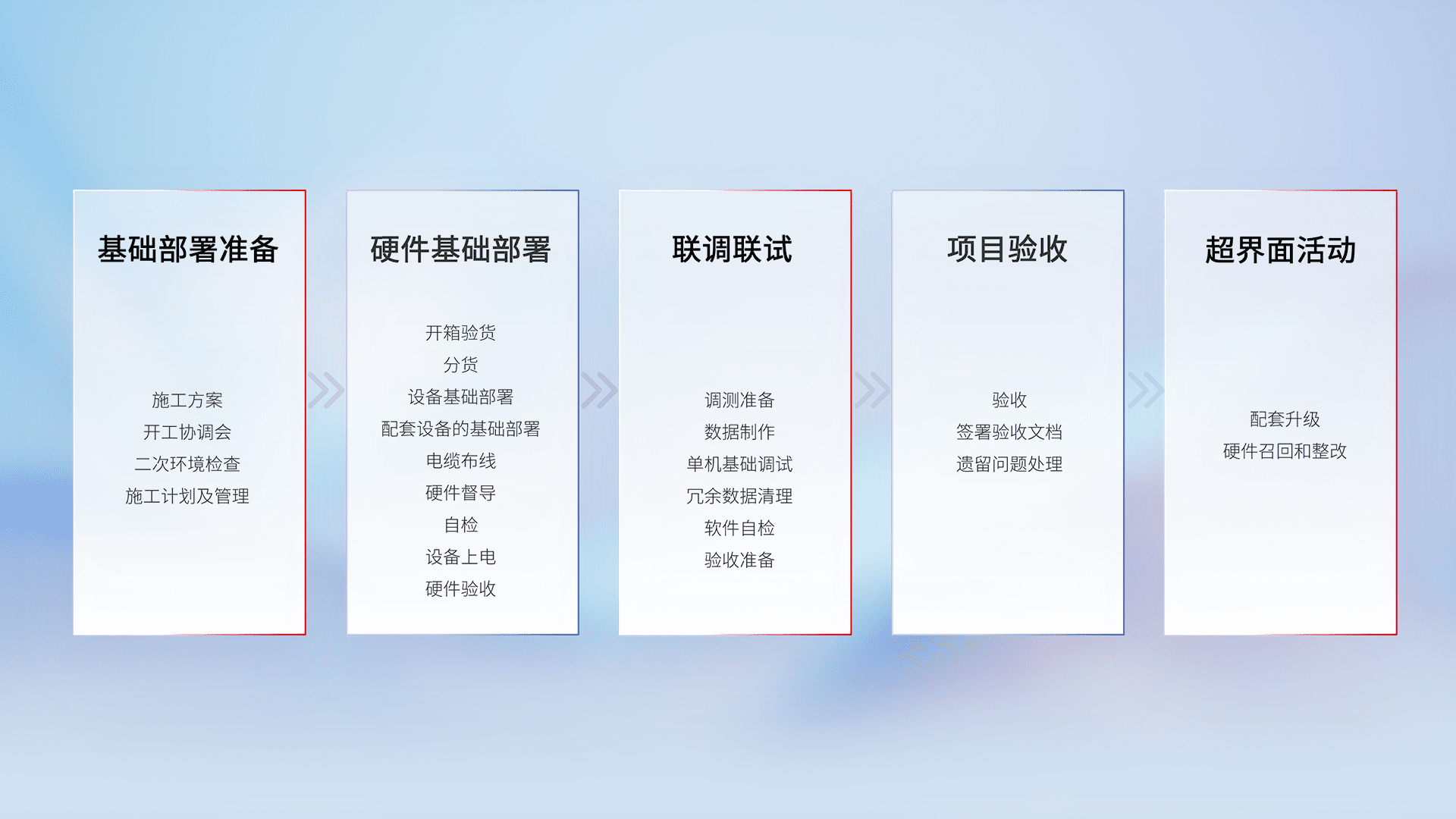 从基础部署准备、、、、硬件基础部署、、、联调联试、、、项目验收、、、、越界面活动的全过程可追溯,,,保证施工质量和进度。。